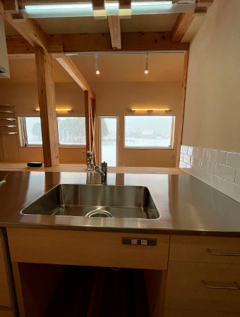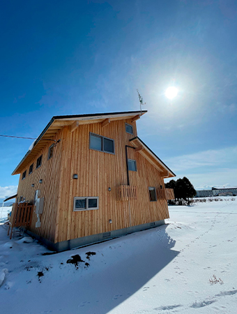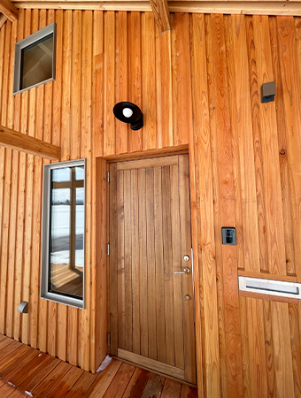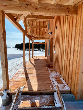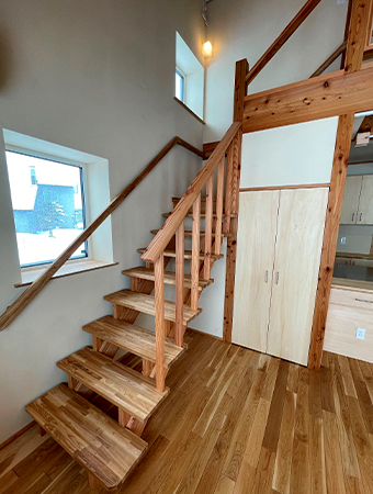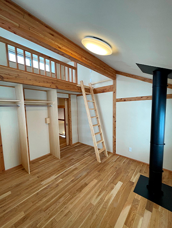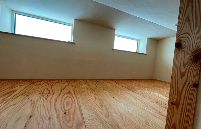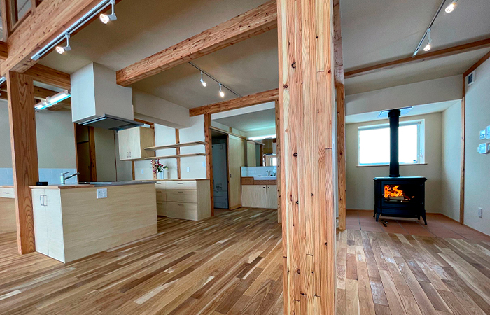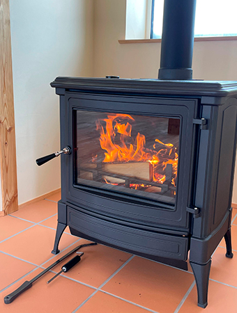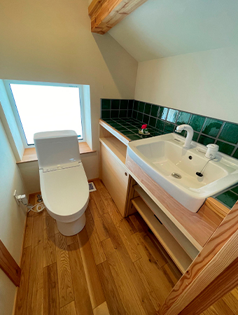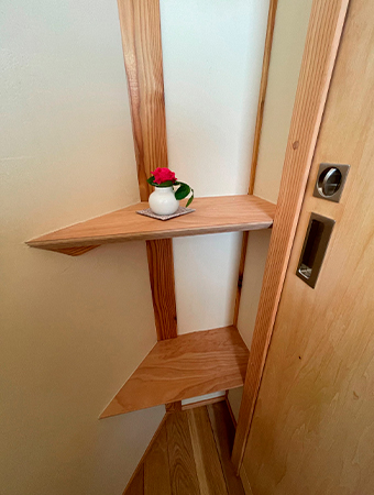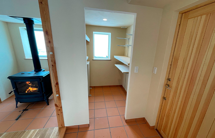 薪ストーブの炎が見えるようにトイレの壁を斜めに