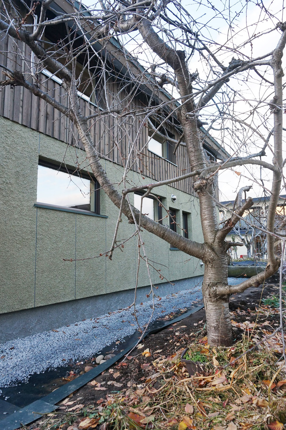 色粉入りのモルタル壁と自然防腐剤塗布のカラマツ板壁はメンテナンスフリー