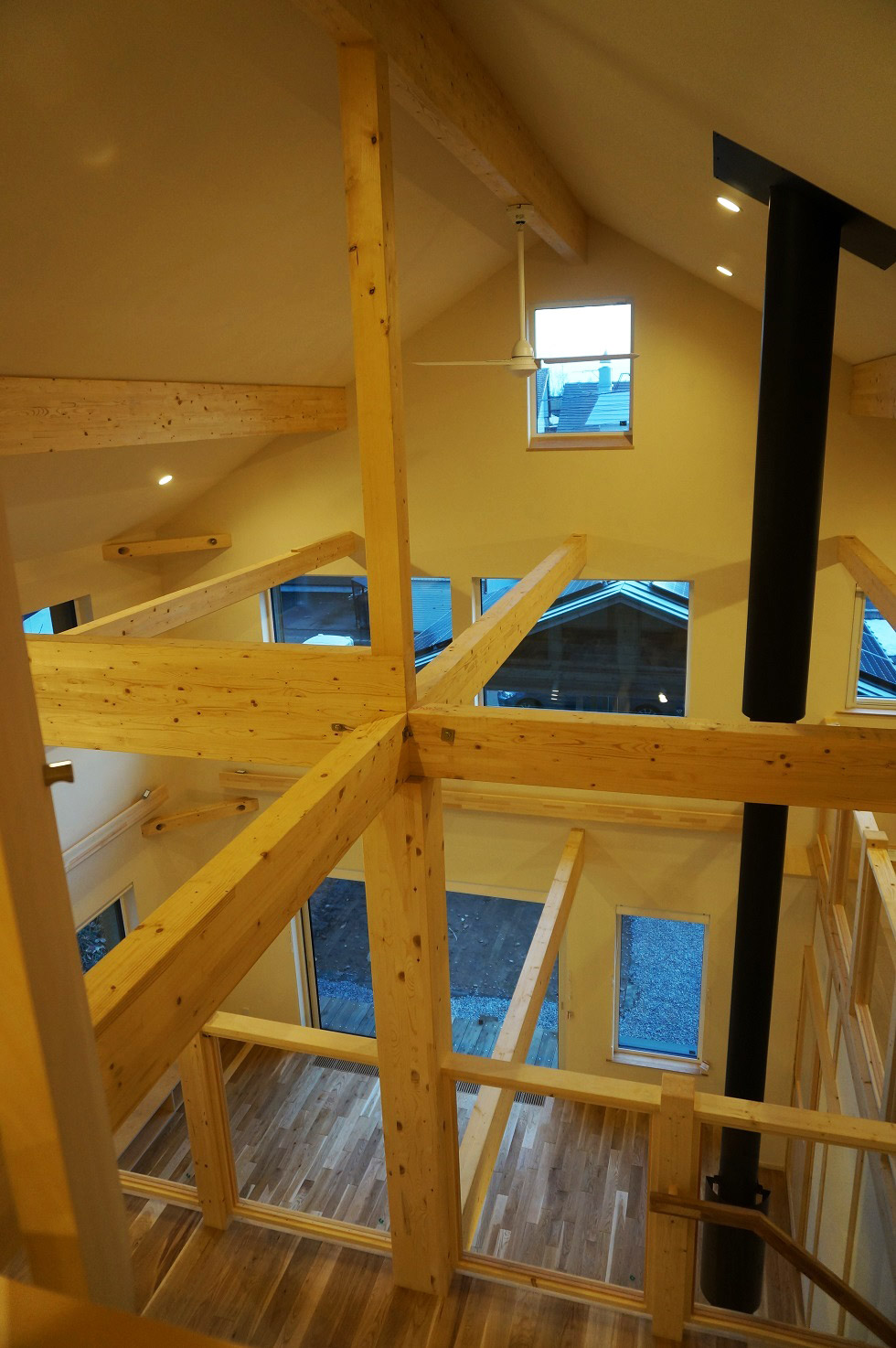 高い吹き抜けと薪ストーブ煙突