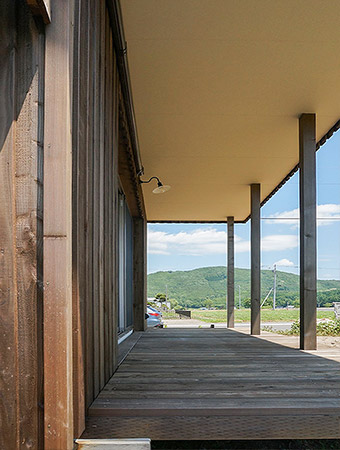 広い屋根付きのウッドデッキ