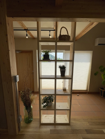 玄関土間には手洗いを設け、収納家具で程よく間仕切り