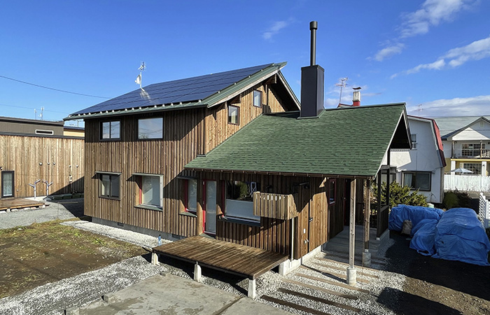 屋根には煙突と太陽光発電パネルでゼロエネルギー住宅