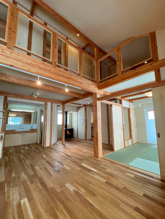 薪ストーブの炎が見えるようにトイレの壁を斜めに
