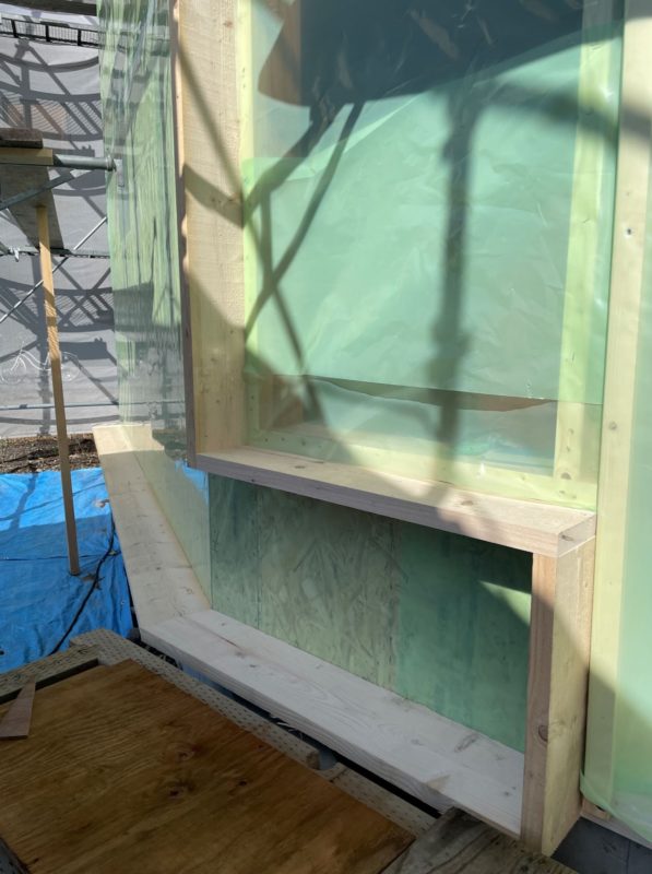 今回の屋根形状は南側の玄関側に雪が落ちる形なので玄関アプローチに長い下屋をつけました、その下屋の部分に屋根から落ちた雪が流れ込まないように防雪柵をつけておきます。