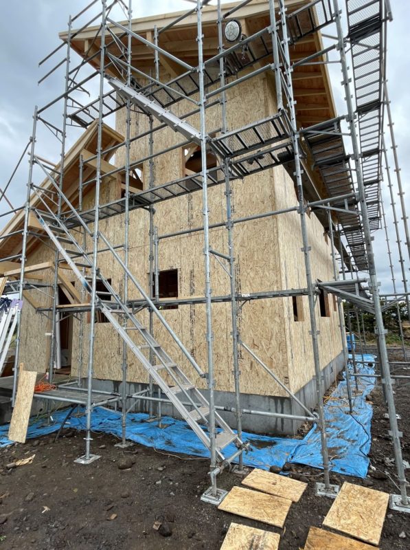 屋根の野地板ができて次は壁の構造用合板を張っています。