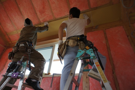 断熱、気密、その次にやっと壁張りですがまずは天井からです、壁と同じ12.5mmの厚手の石膏ボードを張ることで少しでも家全体の熱容量を増やして、温度変化の少ない快適な環境にします。