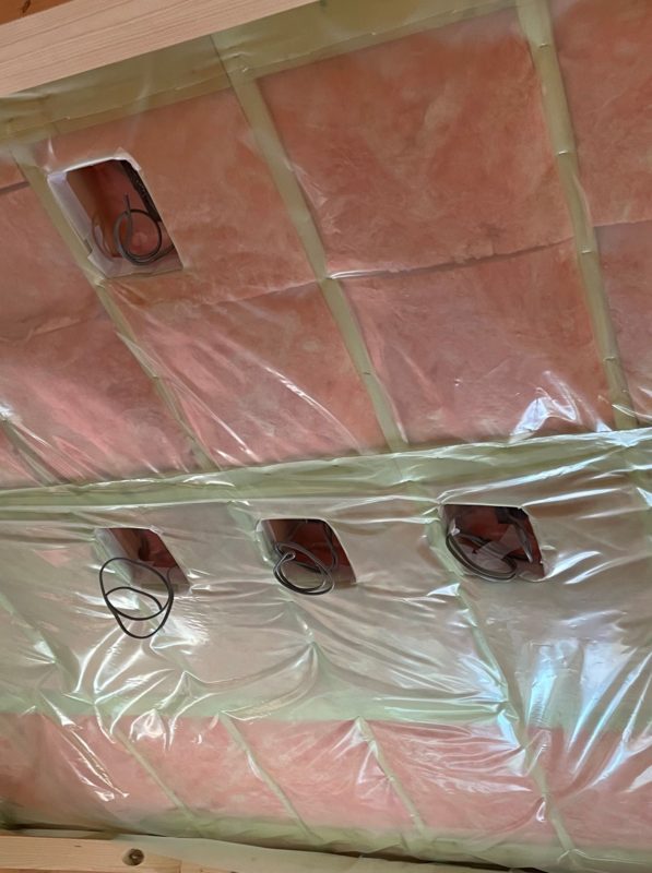 屋根面に取り付けるダウンライトは建築工事として気密BOXをあらかじめ設置しておき、電気配線も気密処理をして出しておきます。