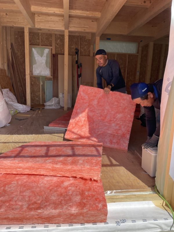 壁の付加断熱材の高性能グラスールを詰めています、雨が降っていますが軒の出が大きいので濡れずに作業ができます。
