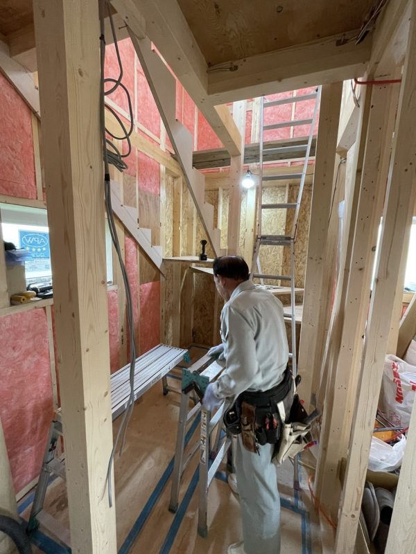 階段の下地を作っています、今回は回り階段をトイレの上に作るのでトイレの天井高さや出入りの建具との高さ等配慮することが多く調整をしながら進めています。