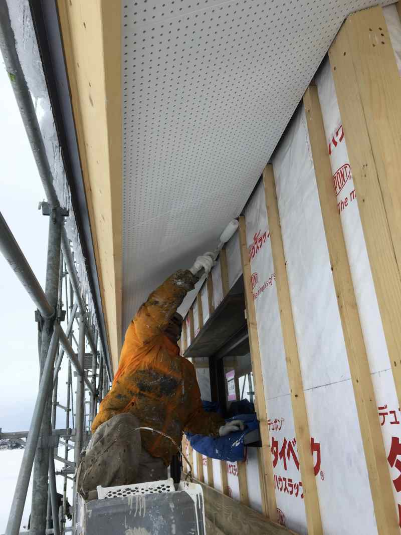 軒天に防火スレートを張る場合は元もと白い素材ではありますが白のペイトで綺麗に塗装します。板を張る前に塗装すれば楽に綺麗に塗装できるからです。