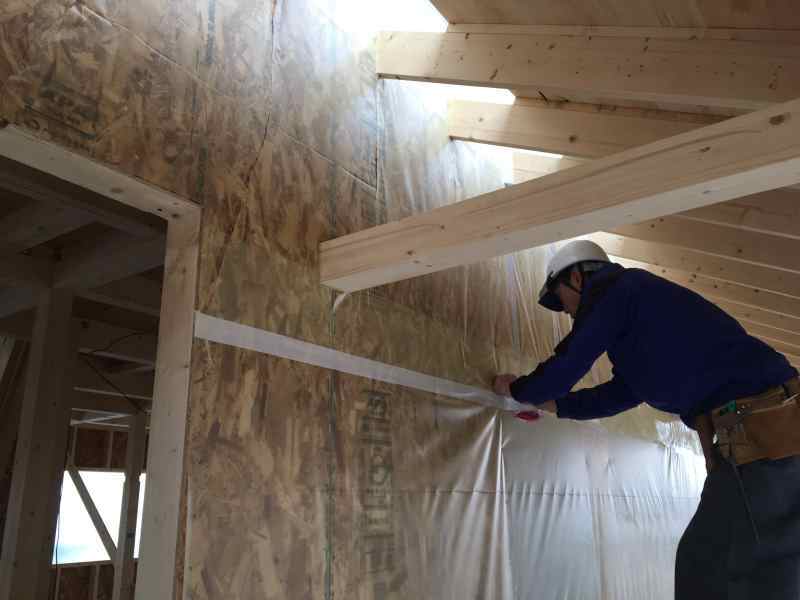 外壁面に耐震強度を保つ面材のOSB合板を全面に張ってその外側に気密防湿シートを張ります。本来このシートは室内に張るものなのですが200mmの付加断熱を外側に施工するのでシート面での温度低下が少なくこの位置に張っても結露の心配がないので外側にはります、室内側に張るよりもきれいに連続してはれるので気密精度も上がります。