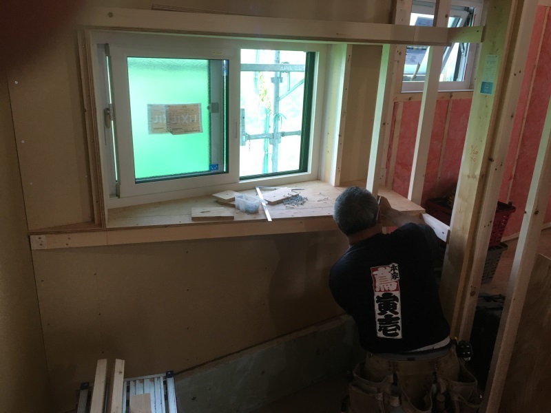敷地形状に合わせて北側の壁が斜めになっていますがユイットバスは真四角です、そこで窓だけ斜めでユニットバスにまっすぐ接続するように大工造作しています。