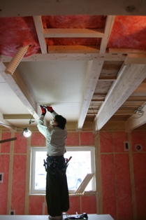 1階の居住エリアは2世帯住宅なのでお互いの生活習慣によって温度も違ってくることが予想されるので、100mmではありますが断熱材を施して天井を上げます。