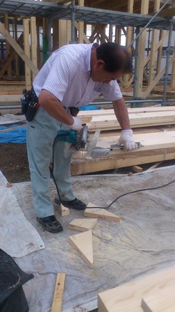 屋根を支える垂木材を構造材の上に渡して留めます。