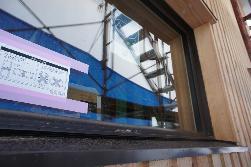 窓下の水切り板金加工です、これも300mm壁断熱で窓が壁の中央に取り付くが故のことです。窓上の庇も板金を巻いています。