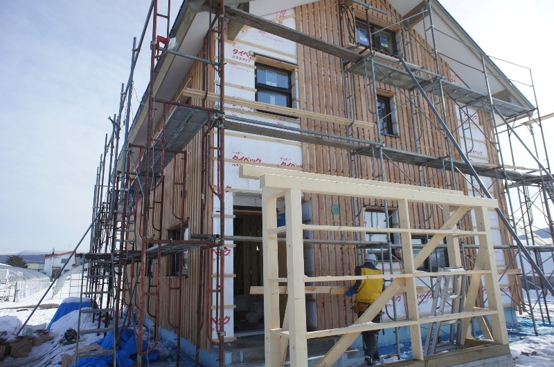 外壁の唐松板はりです、今回は縦張りで100mm巾の板を2枚重ねるようにします、まずはその1枚目、隙間は通気層となりその上に2枚目を張ります。