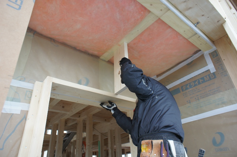 付加断熱のグラスウール入れは1面づつ行い100mmのグラスールを2回入れて200mmの付加断熱を施してすぐにグラスウールが濡れないようにタイベックシート(防風透湿シート)を張ります。