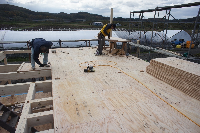 2階の床合板を打ち付けて2階建て方の作業をしやすくします、この28mmのサネ付き合板は床の重みを支えるだけでなく家の水平方面の構造強さを保つための構造材でもあります。