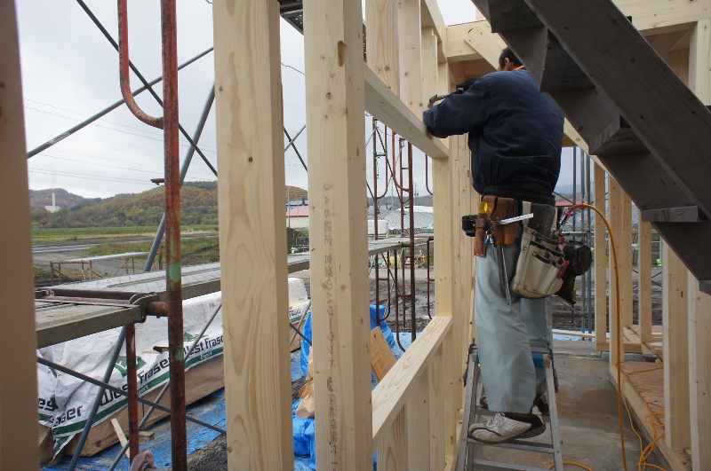 台風崩れの悪天候のなかでしたが2階の建て方完了しました、すぐに1階部分から構造と防火の下地合板であるダイライトを張っています。