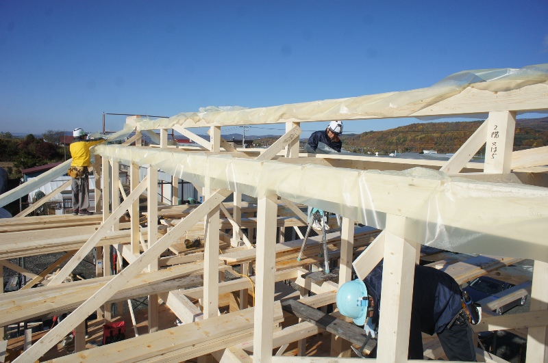 昨日は雨で屋根タルキ等の高所作業は控えました、晴れたので屋根タルキを打つ準備です、まずは母屋や棟木の上に予め気密シートを狭い巾で張っておきます、これは後で室内側の気密シートと密着させて連続した気密層をつくるためのものです。