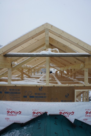 どんどん雪は降り続き屋根に張った透湿暴風シートから雪がすべり落ちて周りに迷惑もかかるので吹雪いている中ではありますが屋根工事を進めることにしました。