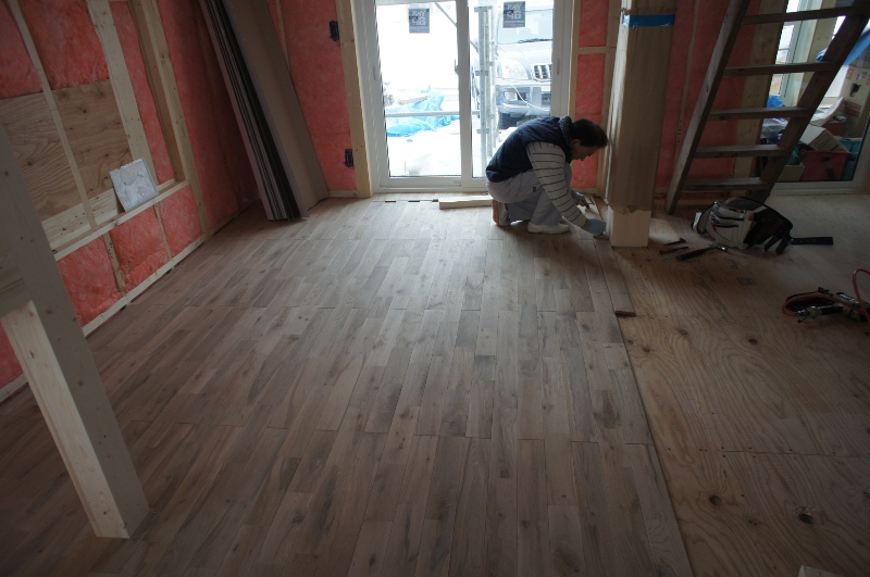 2階のフローリング張りもだいぶ進んでもうすぐ はりじまい です、はじめと最後が肝心です。