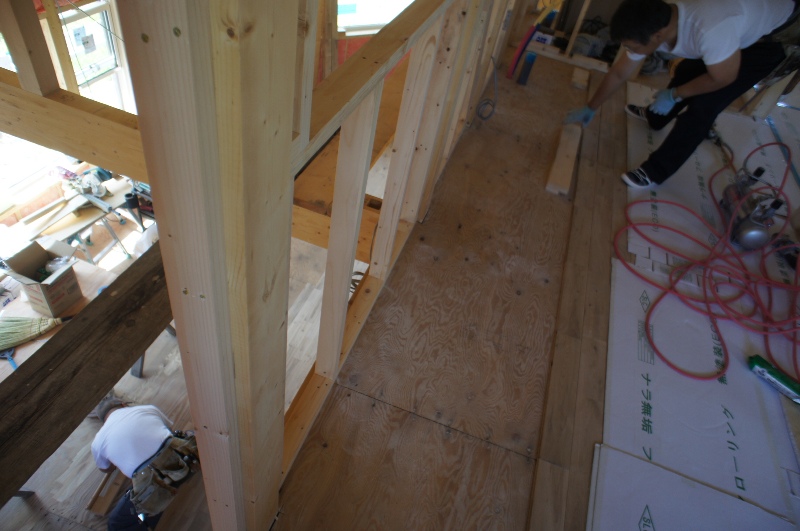1階も2階も同時に無垢フローリングを張っています、1枚の幅が90mmです一般的な合板フローリングは300mmなので3倍も手間がかかりますが、無垢材の風合いのよさや耐久性を考えると必要な手間だと考えています。