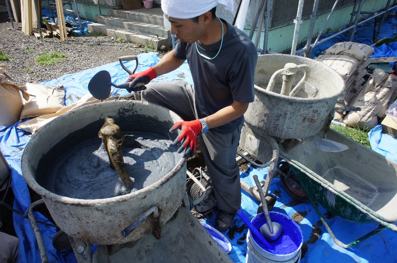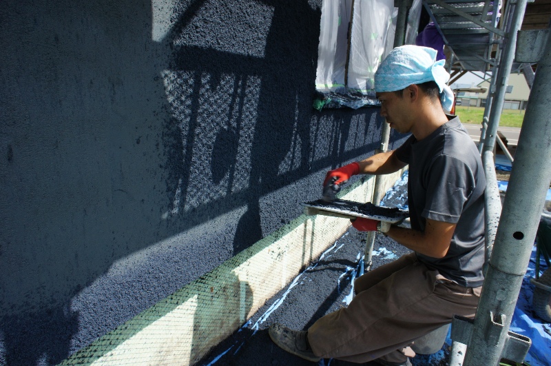 色を入れていない下塗りの上に蒼い色を着けた中塗りモルタルを平らに塗ってから、その上に仕上げに砂状の蒼色モルタルを刷毛で飛ばして中塗りモルタルにくっつけるようにして仕上げます、表面はザラザラですがいい表情を持った壁にしあがります。