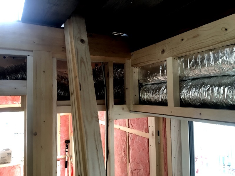 換気ダクトは見えないように囲います、必要以上に天井全体を低くしたくはないので部分的に梁型のように出っ張らせます。数年前まではこのように太い換気ダクトではなく細いダクトで施工していました、それは熱交換換気ではなく外気を壁から部屋に直接吸気してダクトで排気だけをする第3種換気というものです、施工性のよいそれを止めて太いダクトの熱交換換気(第1種換気)に変えた理由はいくつかありますが、まずは燃費です。計算上では3種換気の約半分の暖房燃費になります、家計にも地球にも優しい家への近道です(気密断熱がしっかりしていることが基本条件)次に吸気口からの冷気による不快感の解消です、外気が氷点下20度ならば3種換気では氷点下20度の空気が壁の吸気口から入ってきます、もちろん冷たいし換気口には結露ができます、1種換気ならば+10度を下回ることはありません。そして窓の結露の解消も期待できます、熱交換換気には2種類あって湿度を室内の戻すタイプ(全熱交換)湿度を戻さない(顕熱交換)の2種類があり、国産の熱交換換気装置はほとんどが全熱交換のタイプです、本州の気候にあったタイプですが北海道では欧米の気候に近いので当社ではカナダ製の顕熱交換タイプの熱交換換気装置を使います、換気をすると室内湿度が下がり窓の結露が減ります、高い湿度にしたい場合は加湿器を使うのではなく換気量を減らして湿度を保つことができます。