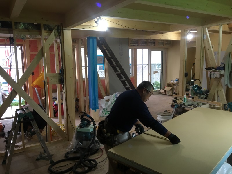 間仕切り壁を張り始めています、電気配線は完了していますが給排水や暖房配管などの設備配管は大工さんと相談しながら同時進行で進めています。