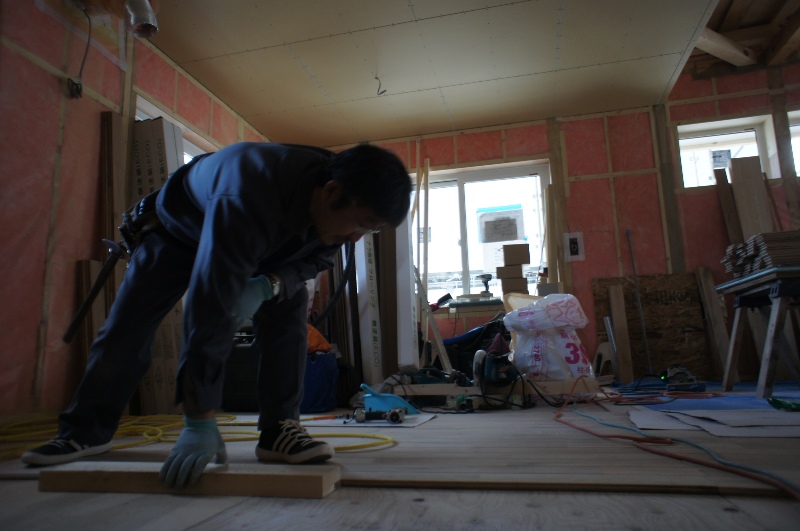2階から床フローリング張りが始まりました、もちろんナラの無垢材です。