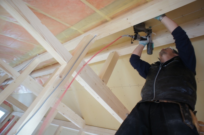 2階の壁は屋根面に接する部分は三角形になります、何処を壁にするか、それともオープンにしておくかはお客様と相談しながら決めました。