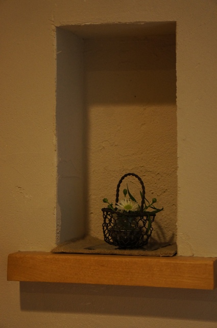 ちょっとした飾棚の花もより美しく見えます、壁の質感の良さは感性を磨くように感じます。