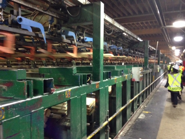 広大な工場内には人は疎らで、環境の整った場所でオペレーターがPCの操作で制御し、一部検品に人手を使っているに過ぎない、この合理化がカナダ材の安さの秘密なのですね。