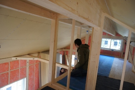 写真は玄関横のシューズクローロークです、熱交換換気装置を設置する場所なのでそのダクトが天井にきています。
