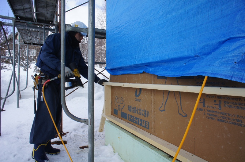 当社の標準仕様は200mm断熱です。外壁側に90mmの付加断熱を施して躯体の105mmと合わせて195mmの壁断熱層を作ります、その下地造りです。